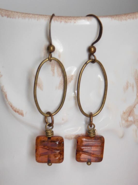 Czech Glass Earrings Boho Chic Antique Brass geometric Square Rustic Woodland Dainty Long Light Earthy Earrings Gift Rustic Jewelry by NickiLynnJewelry