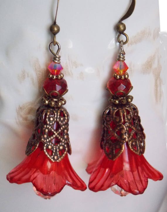 Dangle Flower Earrings Red Victorian Earrings Copper Brass Swarovski Crystal Fire Opal Mixed Earrings Holiday Jewelry Vintage Style Gift by NickiLynnJewelry