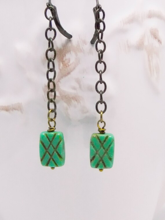 Green Czech Glass Earrings Retro Dangle Earrings Aqua Green Etched Glass Geometric Long Mod Earrings by NickiLynnJewelry