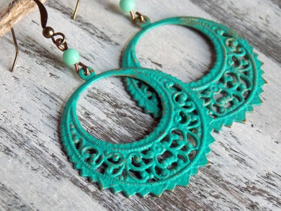Boho Filigree Brass Earrings Turquoise Earrings Patina Earthy Rustic Woodland Filigree Gypsy Boho Brass Bohemian Earrings Jewelry by NickiLynnJewelry