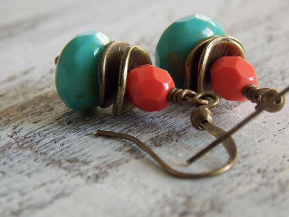 Coral Glass Drop Earrings Turquoise Czech Glass Brass Tropical Earrings Boho Dainty Cute Minimalist Gift For Her Jewelry by NickiLynnJewelry