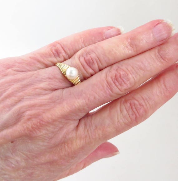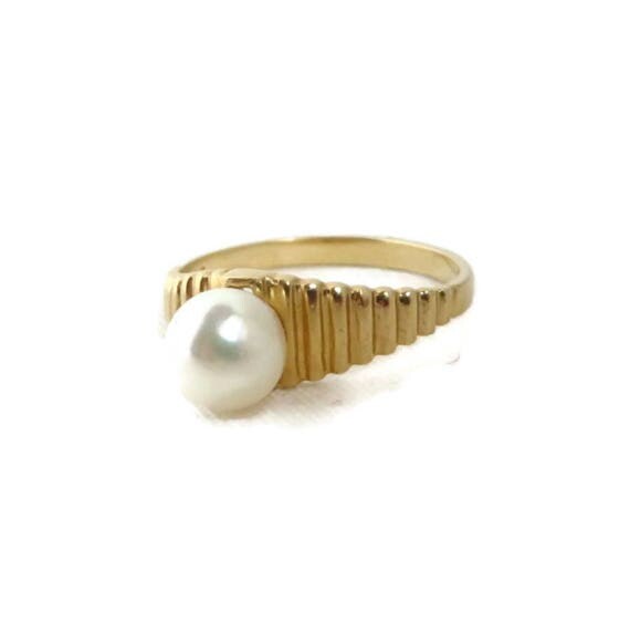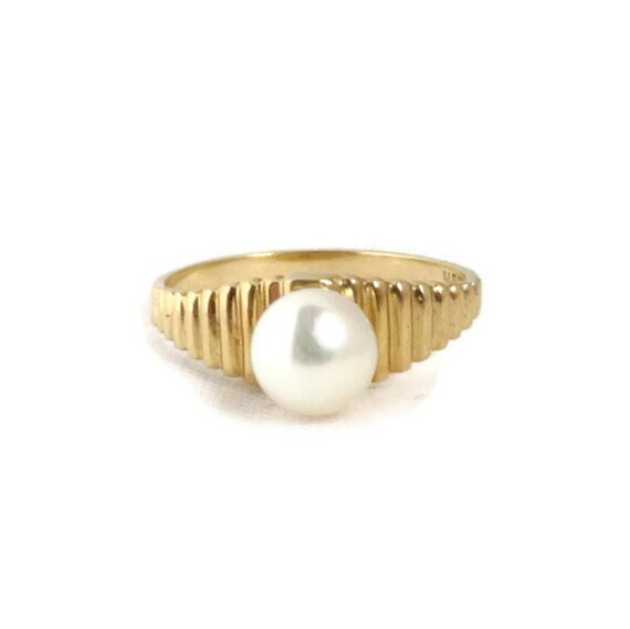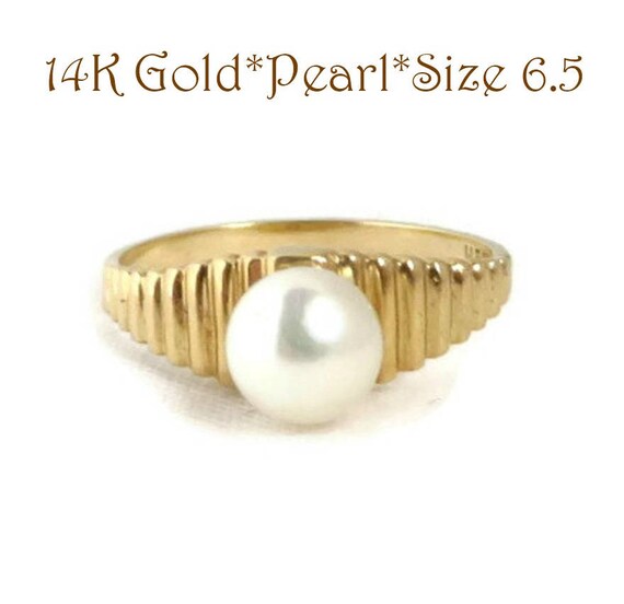 15% OFF coupon on 14K Gold Pearl Ring - Vintage Solitaire Pearl Ridged Gold Band Ring, Genuine Pearl Ring, Gift Idea, Size 6.5 by LeesVintageJewels