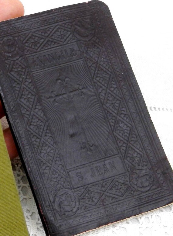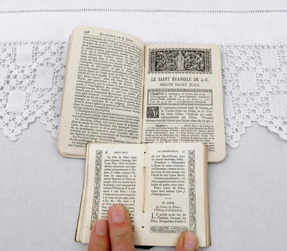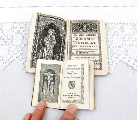 20% OFF coupon on 2 Small Antique French Religious Books 1 Leather Bound "The Gospel of Saint John" 1 Satin bound " The Month of the Sacred Heart", Liturgical by VintageDecorFrancais
