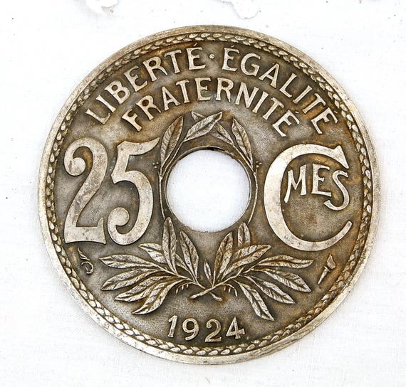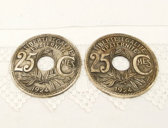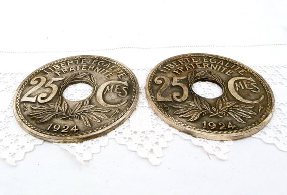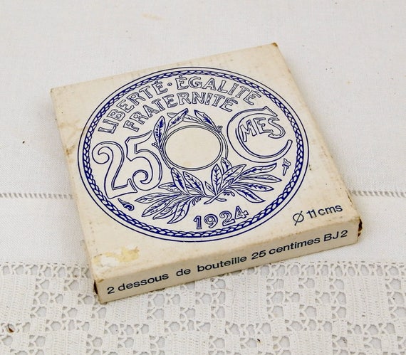 20% OFF coupon on 2 Vintage Cast Metal Coasters for Wine Bottles Shaped as 1924 French Coins with Original Box, Retro Coin Coaster from France, Dinner Party by VintageDecorFrancais