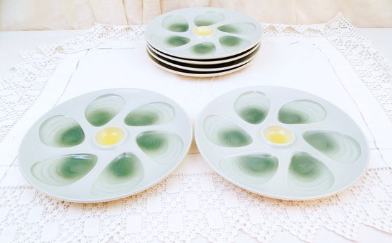 20% OFF coupon on 2 Vintage Mid Century Green and Yellow French Oyster Plates by Salins, Pair Seafood / Shellfish Accessory, Retro 1960s Serving Plate, Food by VintageDecorFrancais