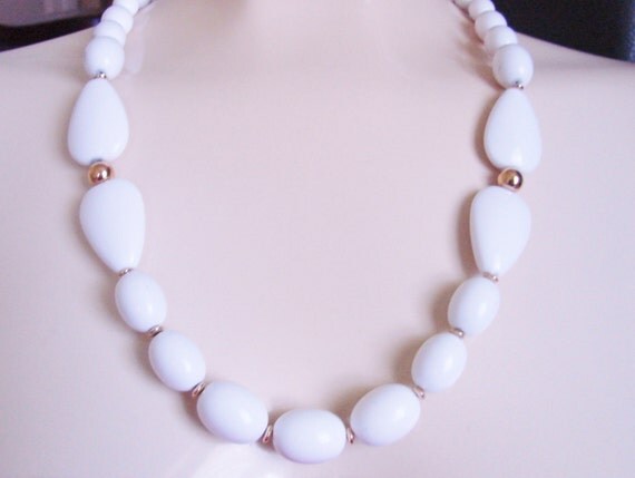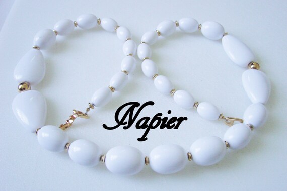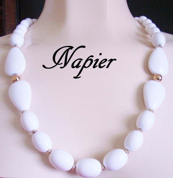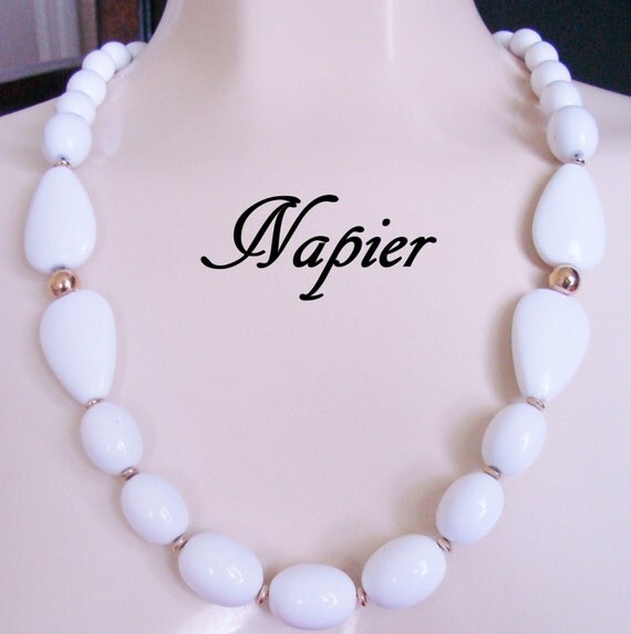 15% OFF coupon on 80s Vintage Napier White Lucite Bead Necklace / Designer Signed / Goldtone Beads / Vintage Jewelry / Jewellery