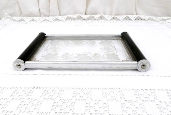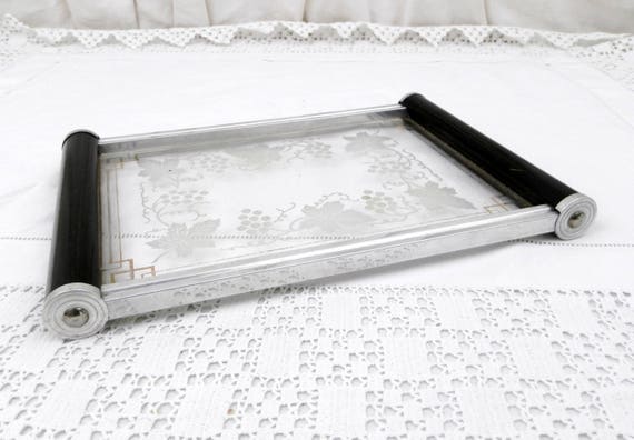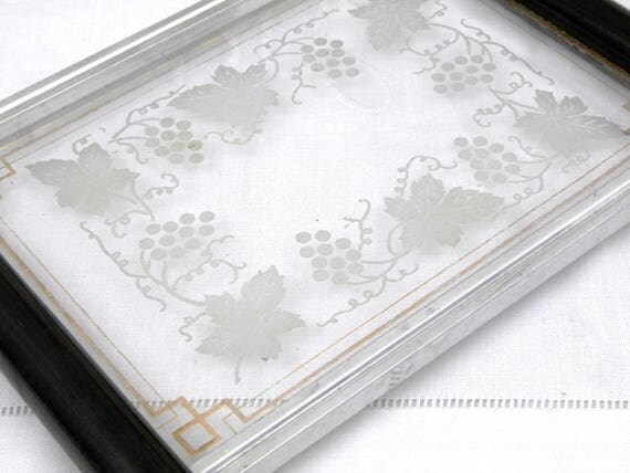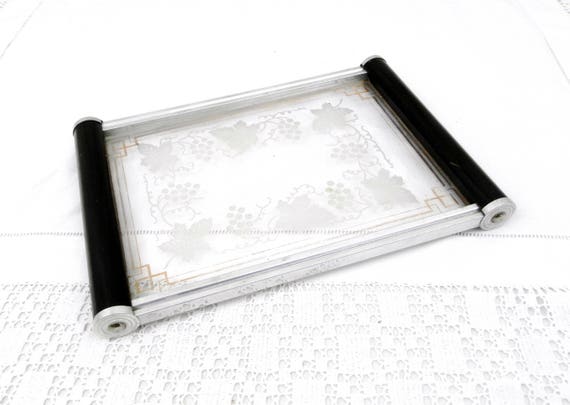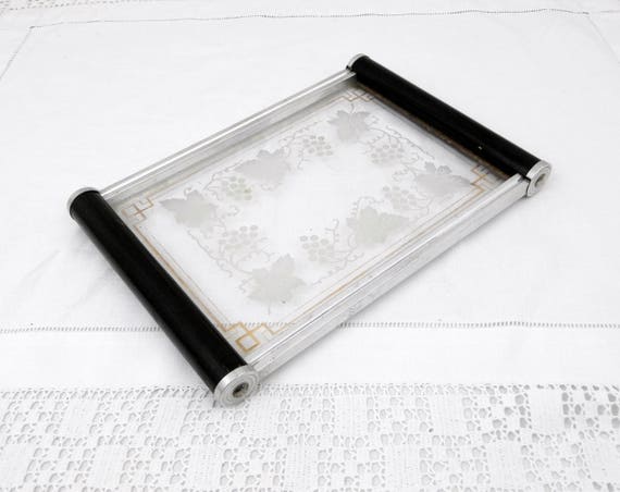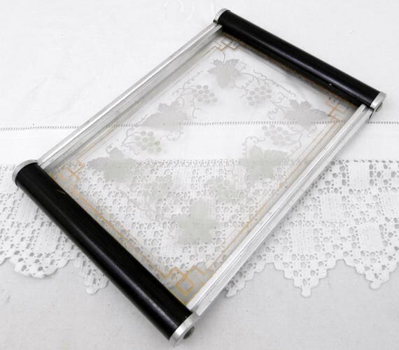 20% OFF coupon on Antique Art Deco Glass Tray with Wooden Handles Gilt Banding and Decorated Vine Leaves and Grape Pattern, Retro Vanity Boudoir Accessory by VintageDecorFrancais