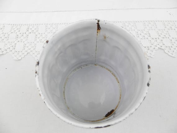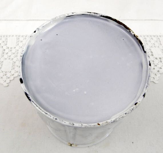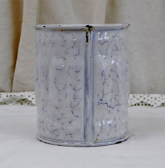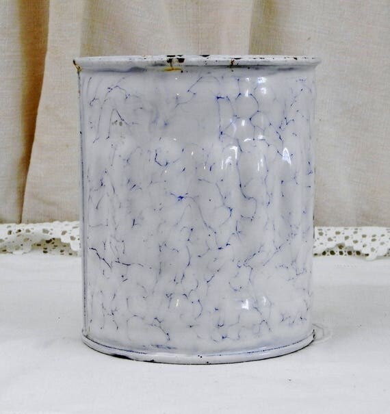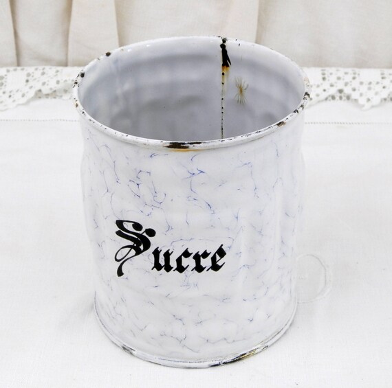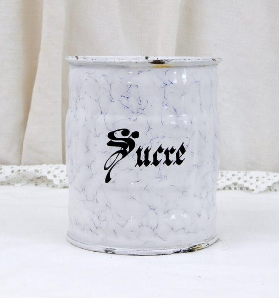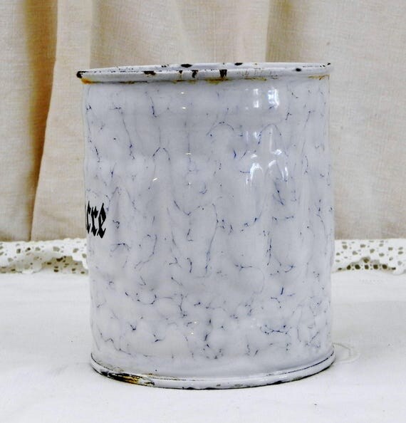 20% OFF coupon on Antique French Chippy White and Blue Marbled Enamel Sugar Canister with Gothic Lettering, French Country Kitchen Enamelware Decor by VintageDecorFrancais