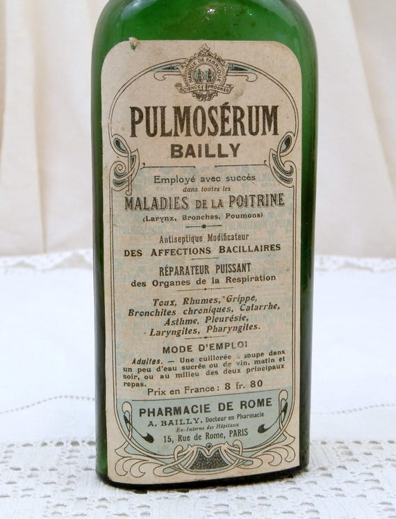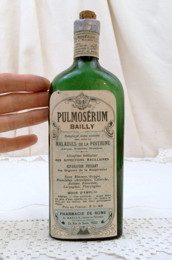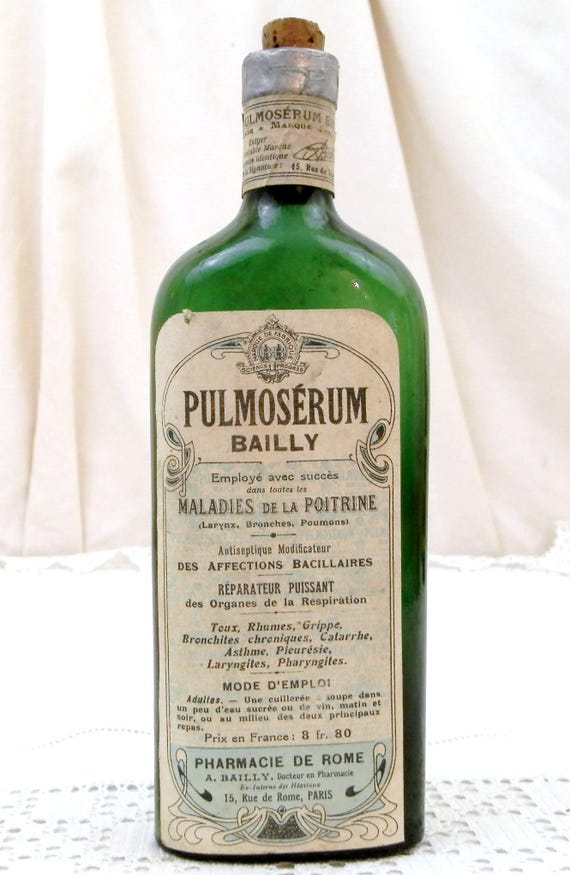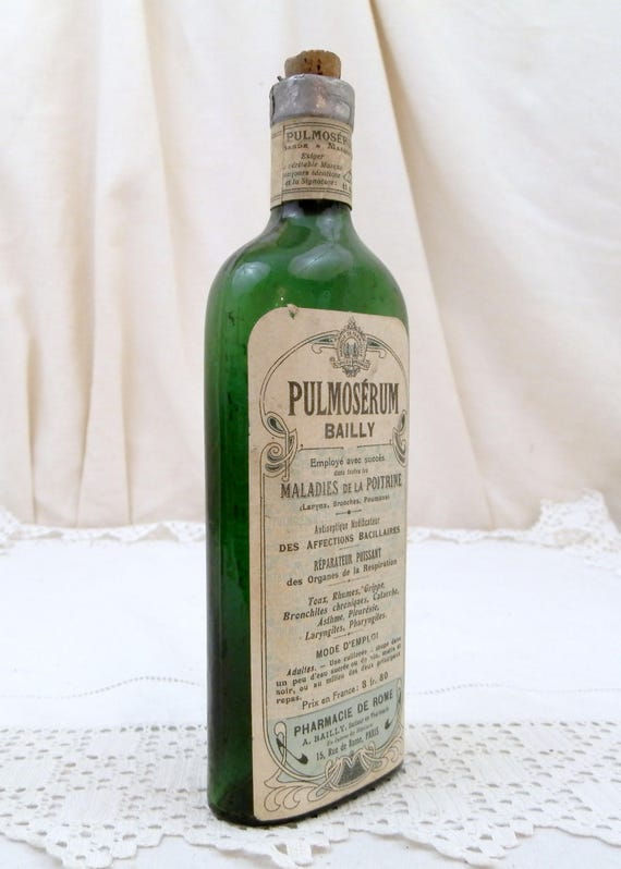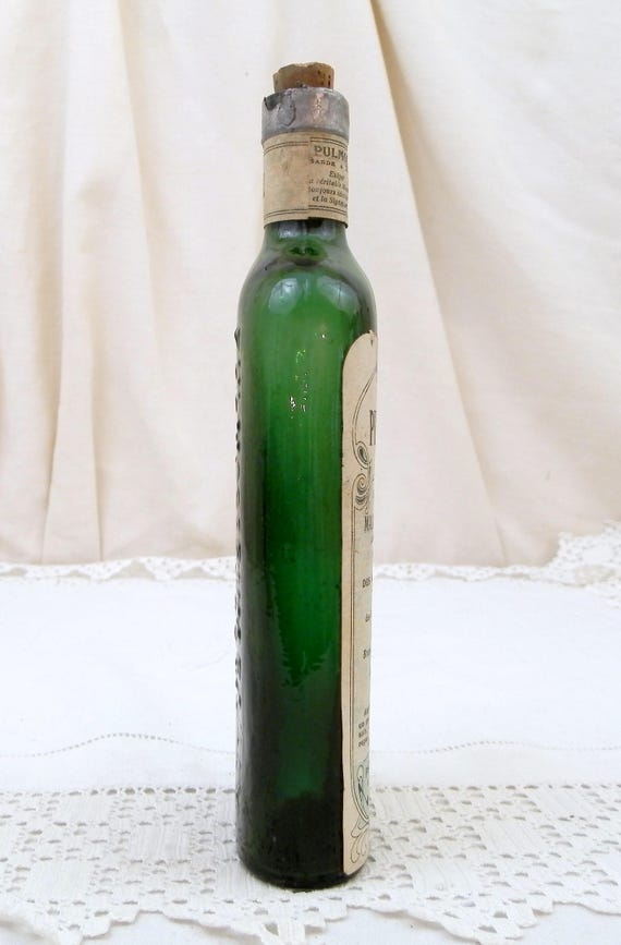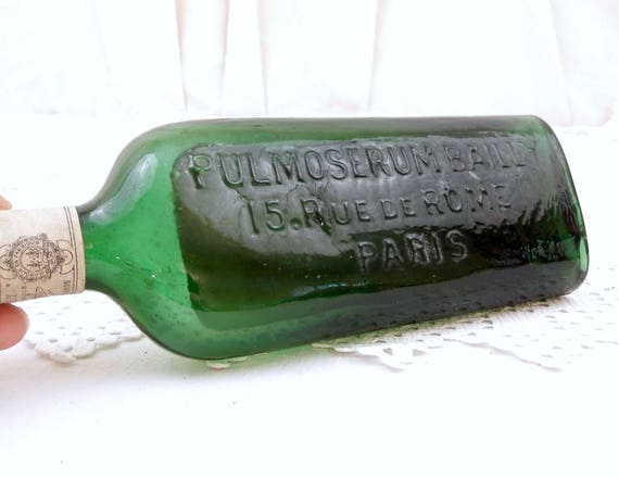 20% OFF coupon on Antique French Cough Syrup "Pulmosérum" Medicine Green Glass Bottle with Original Paper Label from Paris, Apothecary, Belle Epoque France by VintageDecorFrancais