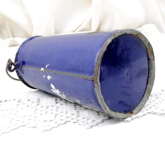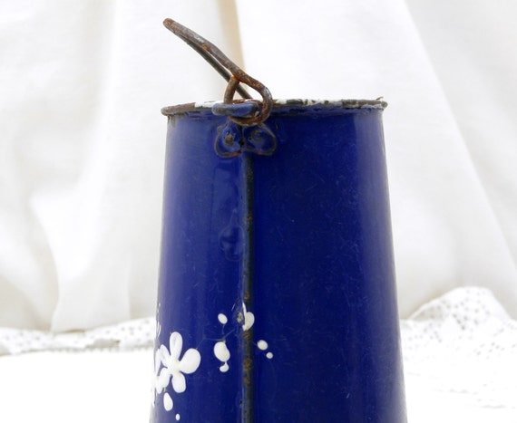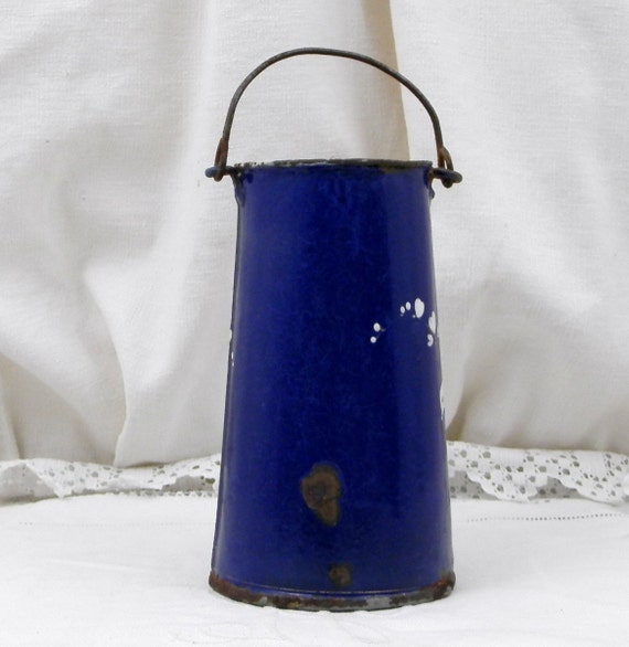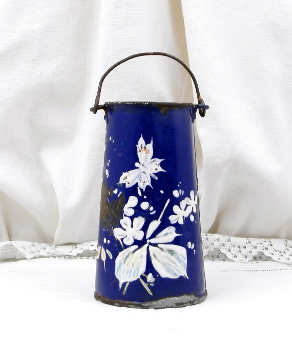 20% OFF coupon on Antique French Early Enamelware Blue with White Hand Painted Flower and Butterfly Pattern Milk Pail / Churn, French Enamel Country Decor by VintageDecorFrancais