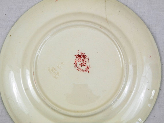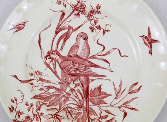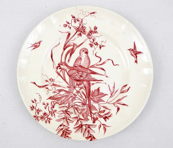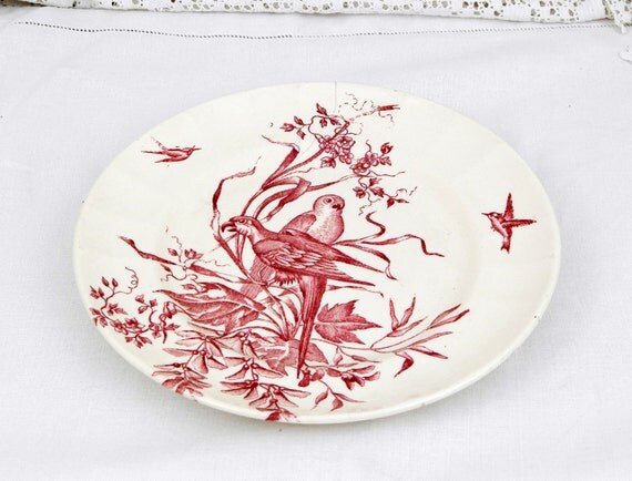 20% OFF coupon on Antique French Ironware Longchamp China Wall Plate with a Burgundy Red 2 Parrots Pattern, Vintage Retro Chateau Chic, French Country Decor by VintageDecorFrancais