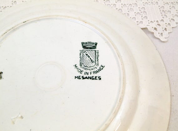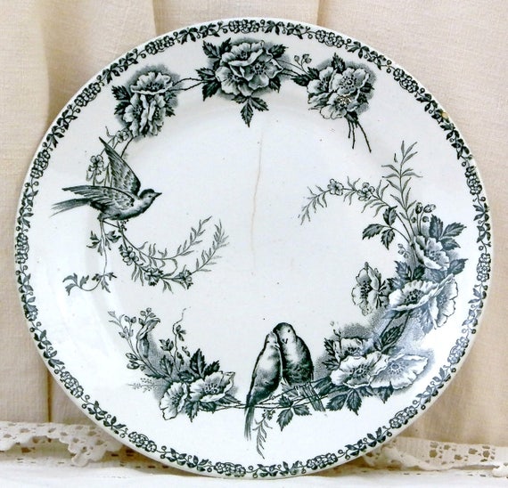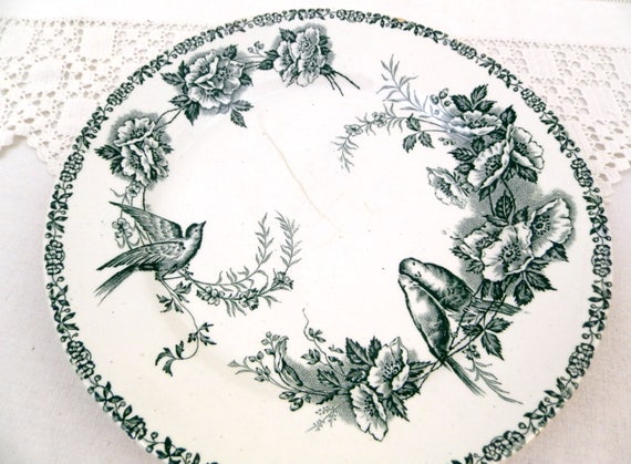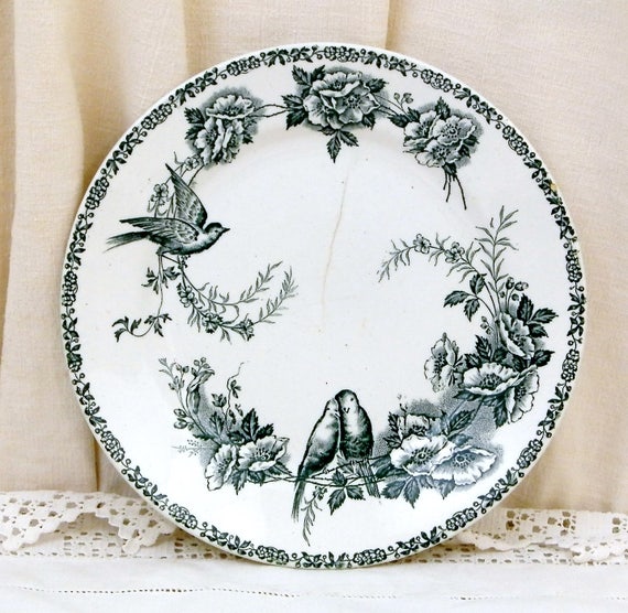 20% OFF coupon on Antique French Ironware Plate With Bird / Bluetit and Rose Flower Transfer Pattern in Teal Blue, St Amand Faience, Pottery from France by VintageDecorFrancais