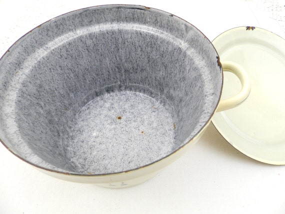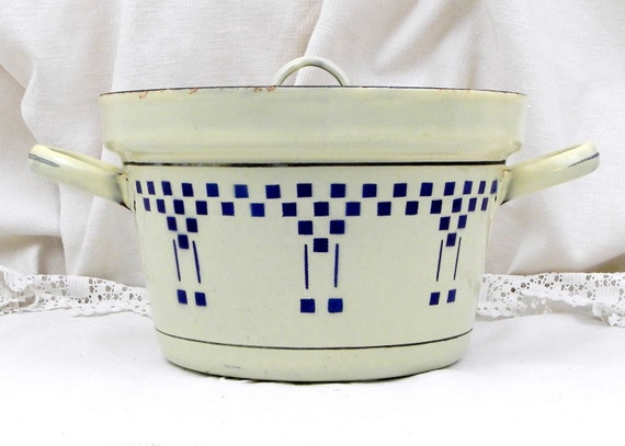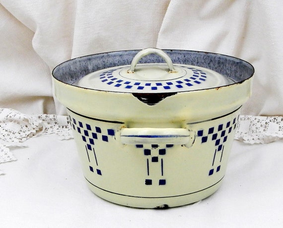 20% OFF coupon on Antique French Lustucru Blue and Pale Yellow Enamelware Lidded Cooking Pot / Pan, Enamel, Cottage Kitchen, Farm Country Decor Rustic Chic by VintageDecorFrancais