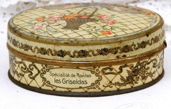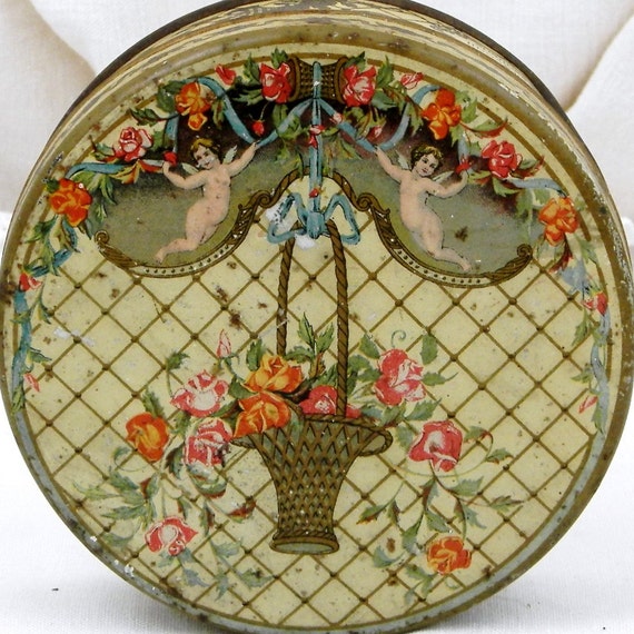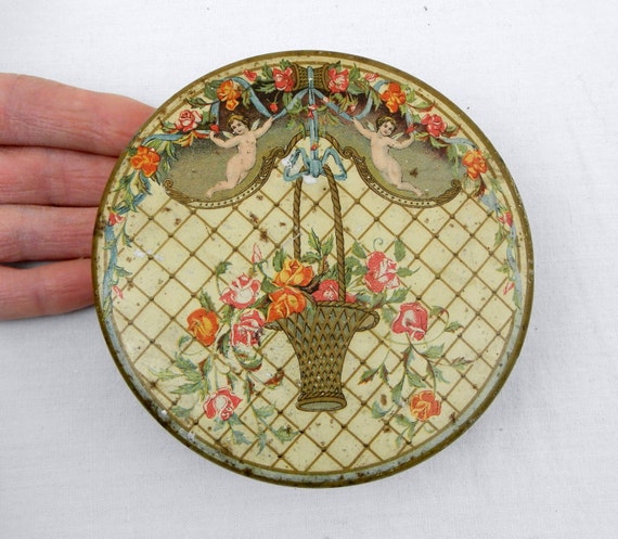 20% OFF coupon on Antique French Metal Candy Tin, Les Griseldas from Nantes Illustration of Cherubs with Basket of Roses, Retro Vintage Home Decor, Country by VintageDecorFrancais
