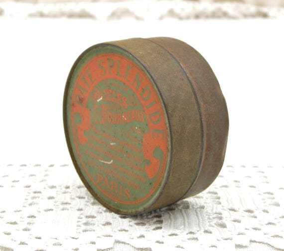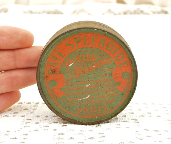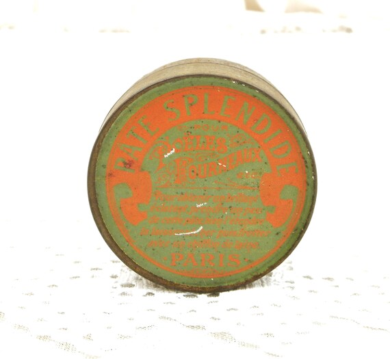 20% OFF coupon on Antique French Metal Tin with Belle Epoque Graphics in Orange and Green Range Paste "Pate Splendide" from Paris, Polish Box from France by VintageDecorFrancais