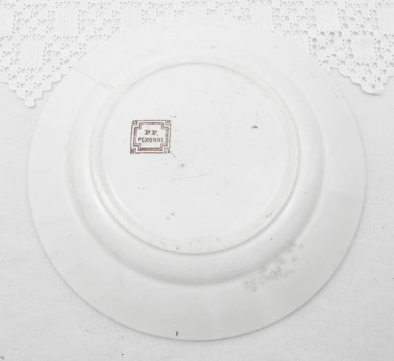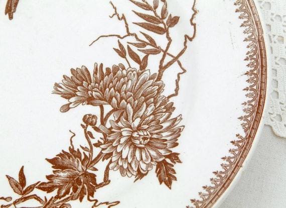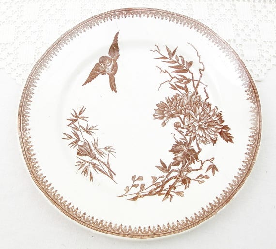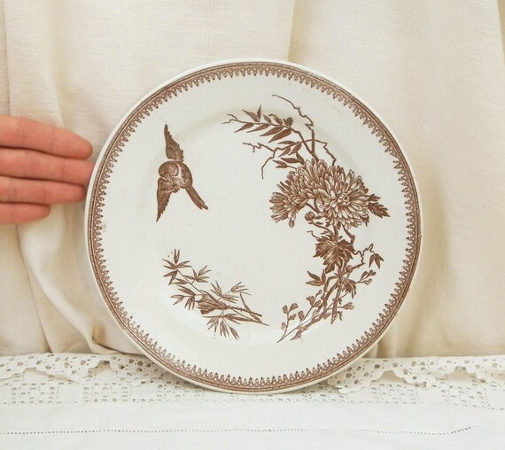 20% OFF coupon on Antique French Plate Bird and Flower Pattern in Chocolate Brown on White Glaze by FF Pexonne Badionviller, Victorian Plate from France, 1880 by VintageDecorFrancais