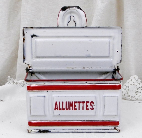 20% OFF coupon on Antique French Saint Servais White and Red Enamelware Box for Matches, French Country Decor, Vintage Retro French Home, Enamel Matchbox by VintageDecorFrancais