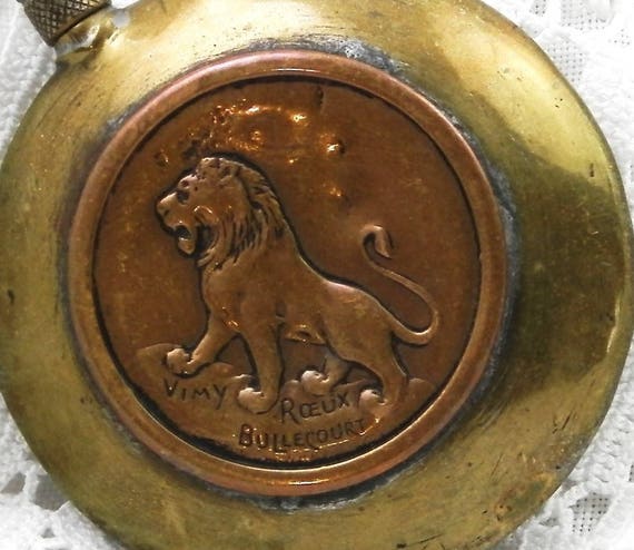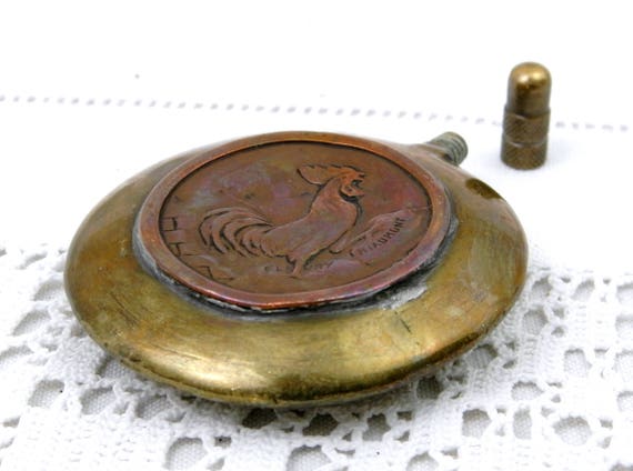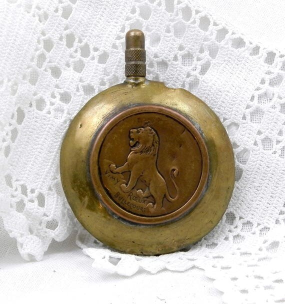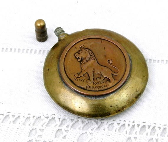 20% OFF coupon on Antique French Trench Art WW1 Powder Flask in Copper and Brass with Embossed Lion Rooster Inscribed Vimy Roeux Bullecourt Fleury Thiaumont by VintageDecorFrancais