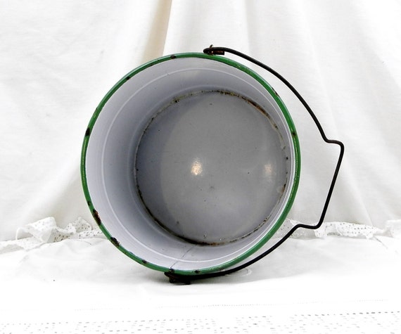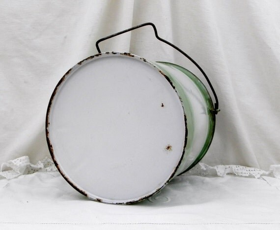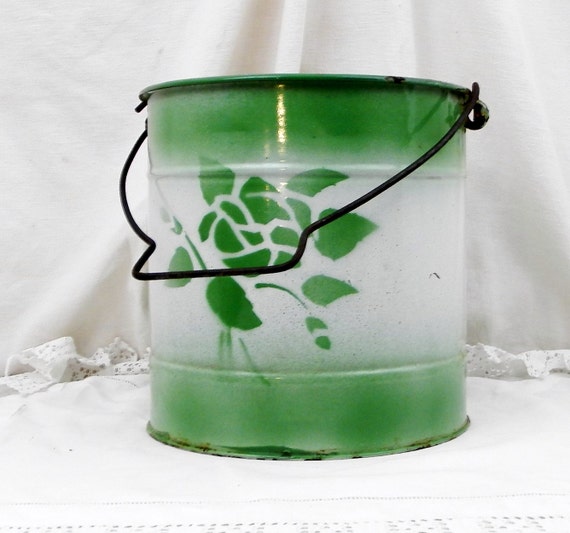 20% OFF coupon on Antique French White and Green Enamel Bucket with Stenciled Rose Pattern, French Enamelware Country Decor Plant Pot, Shabby Cottage Chic by VintageDecorFrancais