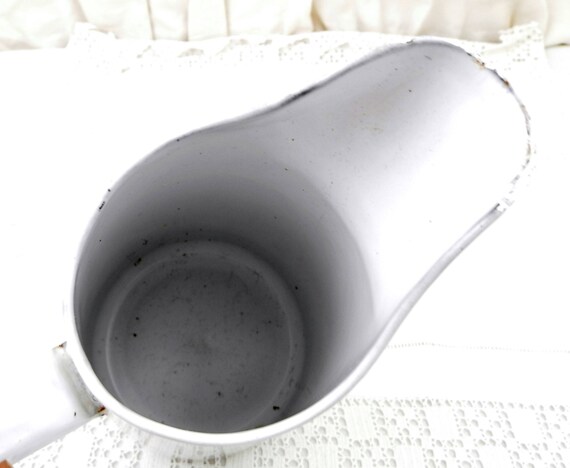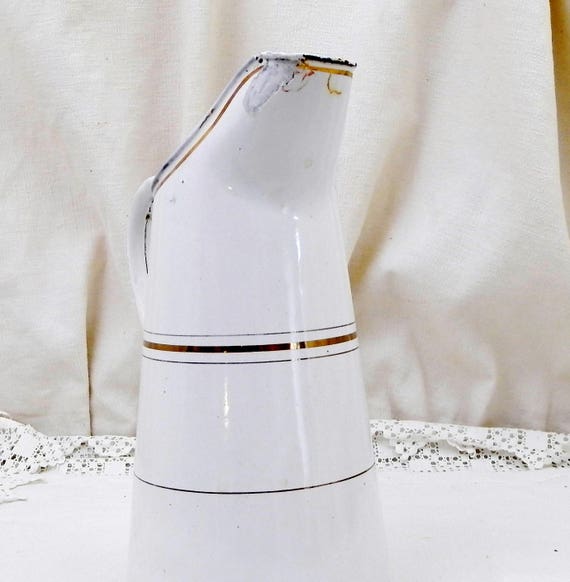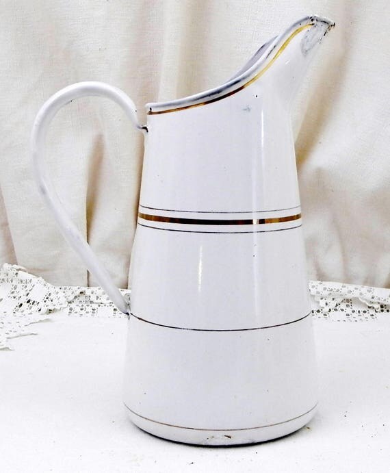20% OFF coupon on Antique French White with Gold Bands Enamelware Pitcher, Chippy Cottage Kitchen Enamel Jug, French Country Chateau Shabby Chic Decor, by VintageDecorFrancais