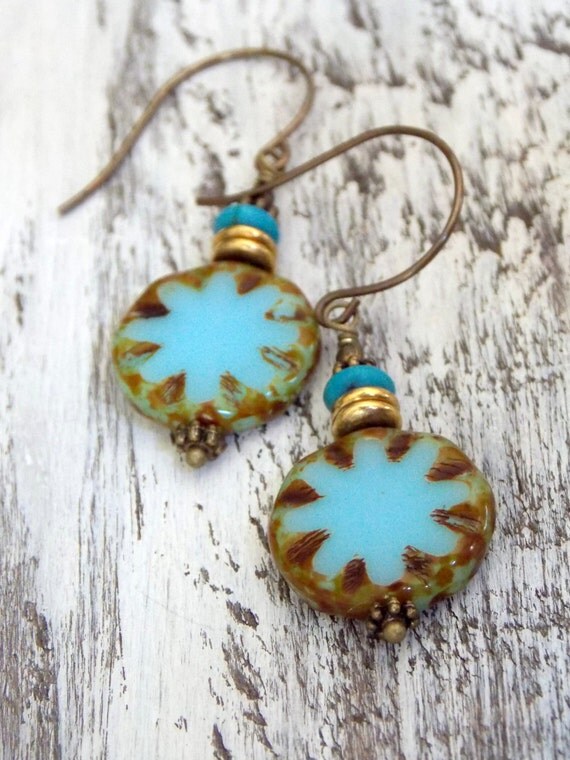 FREE SHIPPING coupon on Bohemian Czech Glass Earrings Turquoise Blue Brass Beachy Boho Earrings Dangle Textured Drop Earrings Jewelry Rustic Woodland Earrings by NickiLynnJewelry