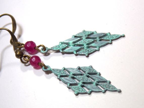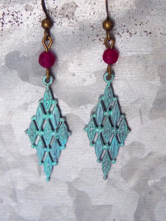 FREE SHIPPING coupon on Brass Patina Earrings Turquoise Ruby Gemstone Earrings Bohemian Earrings Boho Gypsy Earrings Brass Stamping by NickiLynnJewelry