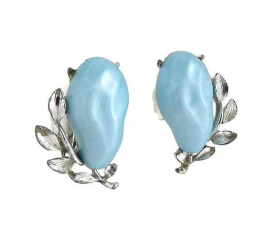 15% OFF coupon on BSK Blue Lucite Earrings, Vintage Light Blue Silver Tone Leaf Clip-on Earrings, Kidney Shape Earrings by LeesVintageJewels