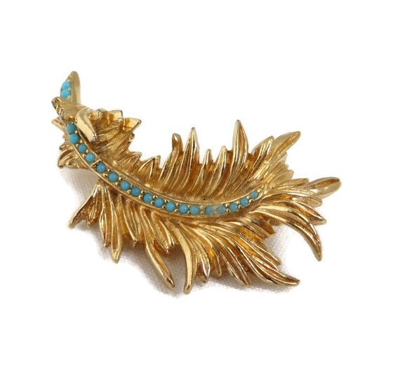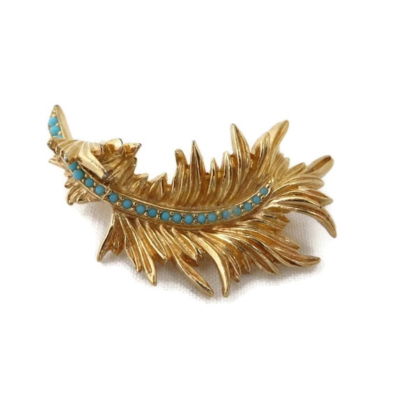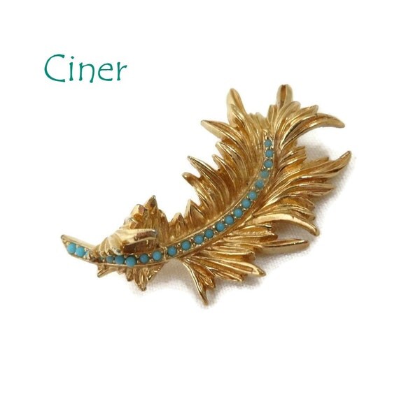 15% OFF coupon on Ciner Gold Tone Leaf Brooch, Vintage Turquoise Beaded Curly Leaf Pin, Signed Designer Gift for Her by LeesVintageJewels