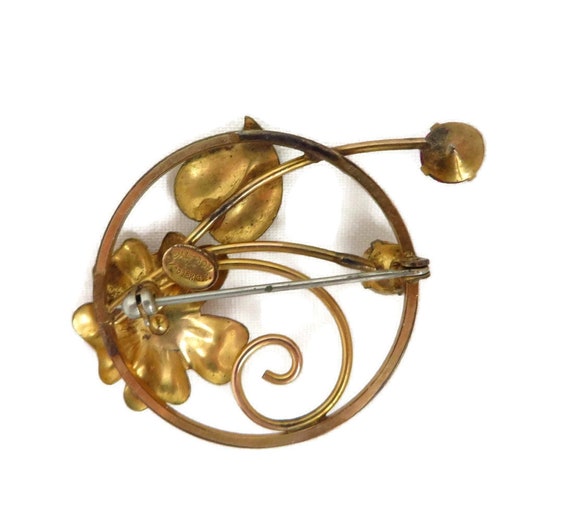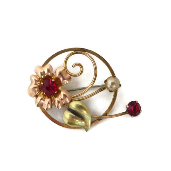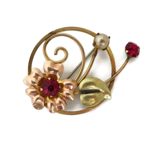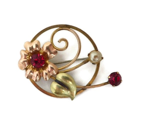 15% OFF coupon on Circle Pin, Vintage Gold Filled Designer Brooch, BAL-RON 1/20 12K GF Circle Pin, Red Rhinestone Flower Brooch, Gift for Her by LeesVintageJewels