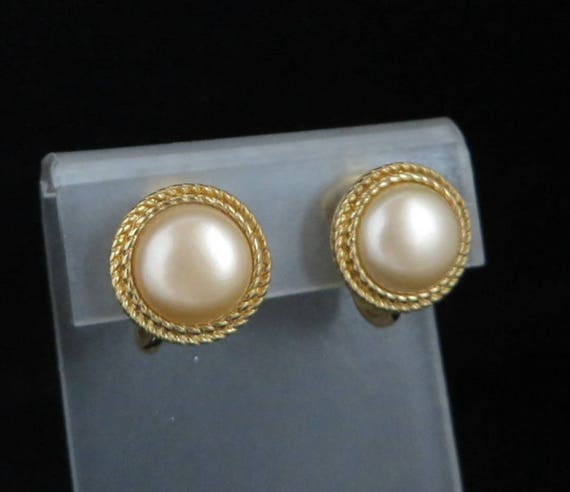 15% OFF coupon on Crown Trifari Faux Pearl Earrings Vintage Braided Gold Tone Button Clip-ons Estate Costume Jewelry Designer Signed Clips by LeesVintageJewels