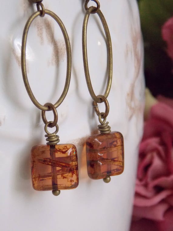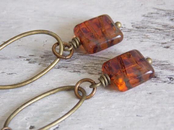FREE SHIPPING coupon on Czech Glass Earrings Boho Chic Antique Brass geometric Square Rustic Woodland Dainty Long Light Earthy Earrings Gift Rustic Jewelry by NickiLynnJewelry
