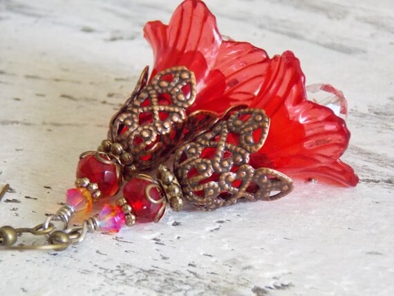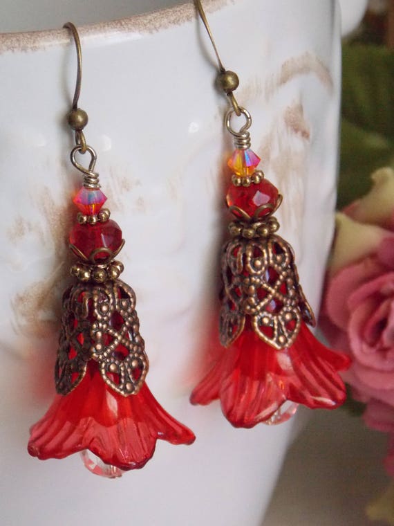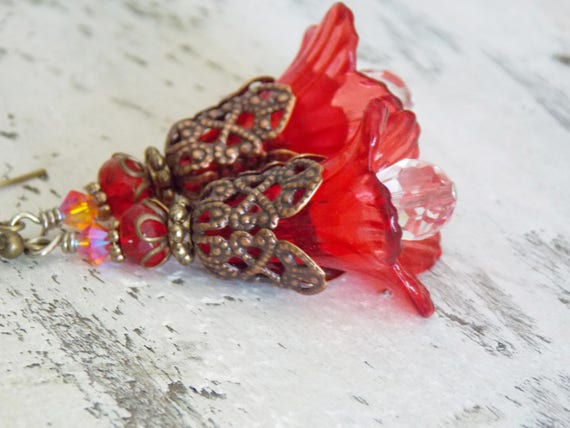 FREE SHIPPING coupon on Dangle Flower Earrings Red Victorian Earrings Copper Brass Swarovski Crystal Fire Opal Mixed Earrings Holiday Jewelry Vintage Style Gift by NickiLynnJewelry