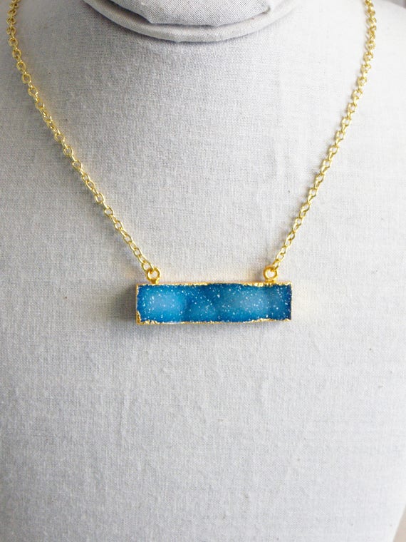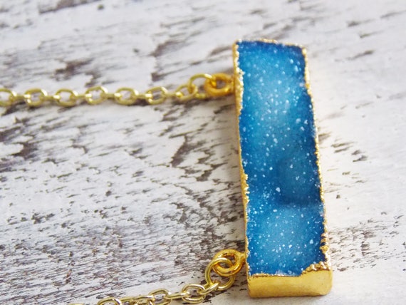 FREE SHIPPING coupon on Druzy Necklace Rectangle Druzy Bar Necklace Gold Edged Druzy Pendant Blue Color Stone Gold Edged Druzy Stick Jewelry Mineral Boho Necklace by NickiLynnJewelry