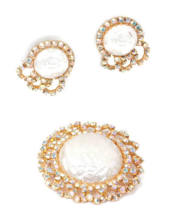 15% OFF coupon on Faux Pearl and AB Rhinestone Brooch and Earrings Vintage Set