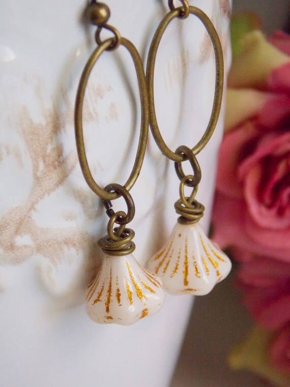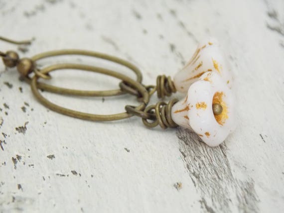 FREE SHIPPING coupon on Flower Earrings Ivory Czech Bells Boho Chic Antique Brass Rustic Woodland Dainty Long Light Earthy Earrings Gift Rustic Jewelry by NickiLynnJewelry