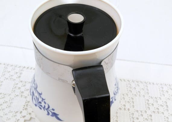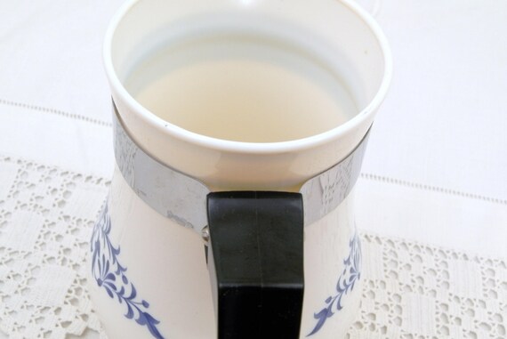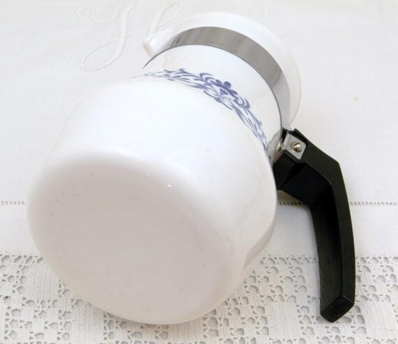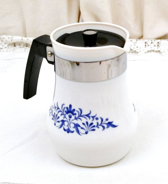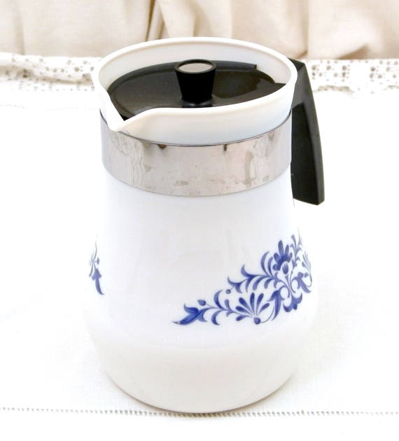 20% OFF coupon on French Vintage Mid Century 1960s White Milk Glass Coffee Pot with Blue Pattern by Sovirel, Retro Kitchenalia from France, Pyrex , Acropal by VintageDecorFrancais