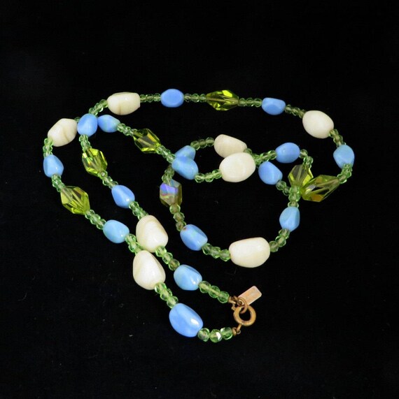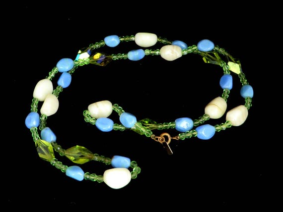 15% OFF coupon on Hattie Carnegie Necklace Vintage Glass Bead Necklace, Signed Carnegie Necklace Blue, Green, Cream Art Glass Necklace, 29 inches by LeesVintageJewels