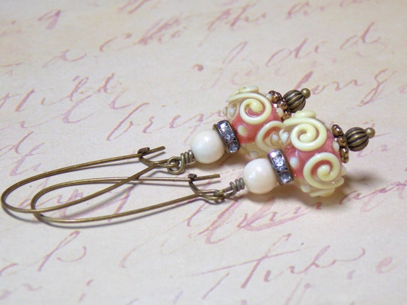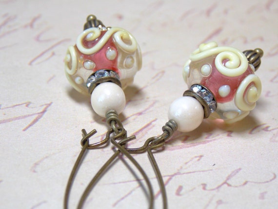 FREE SHIPPING coupon on Ivory Swirl Earrings, Pink Lampwork Earrings,Ivory And Pink Earrings, Rhinestones Antique Brass Czech Beaded Earrings by NickiLynnJewelry