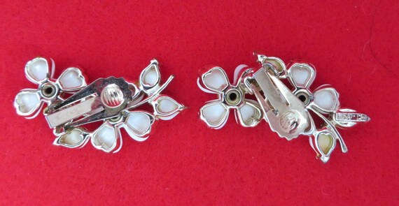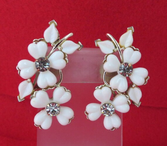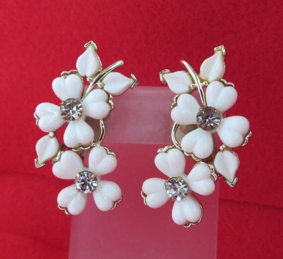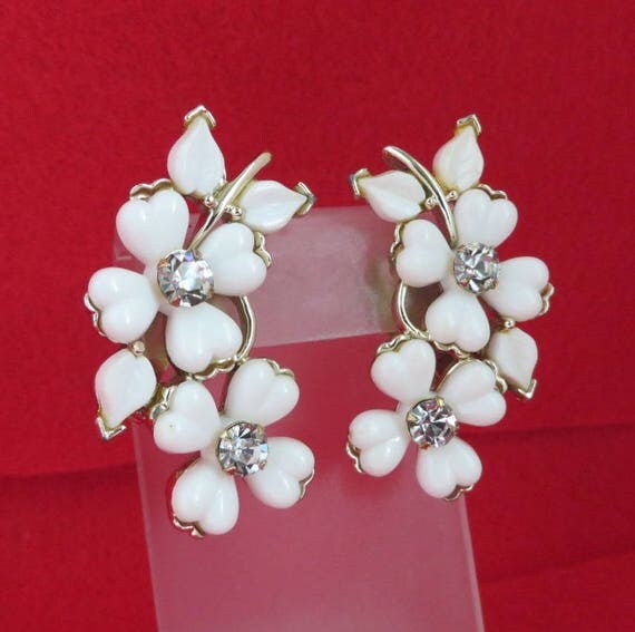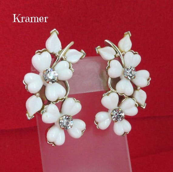 15% OFF coupon on Kramer White Flower Earrings, Vintage Lucite Rhinestone Silvertone Clip-ons, Valentine's Day Gift by LeesVintageJewels