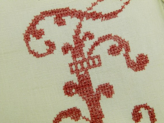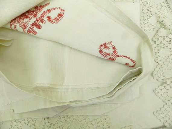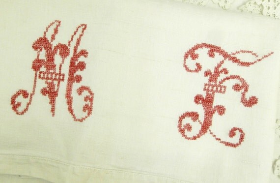20% OFF coupon on Large Antique French Hand Embroidered Monogram Red Cross Stitch M F on Large Cotton Metis Cloth/ Shabby Chic/ Home Interior / French Country by VintageDecorFrancais