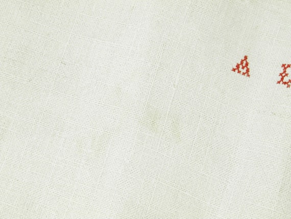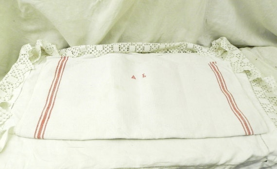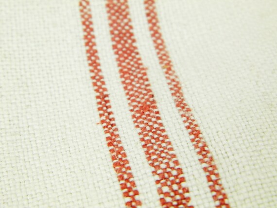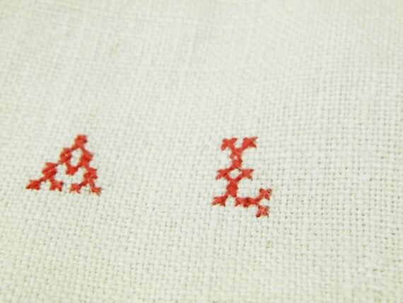 20% OFF coupon on Large Antique French Linen Tea Towel with Woven Red Stripes and a 2 Small Red Cross Stitch Monogram A L / French Country Kitchen Decor by VintageDecorFrancais