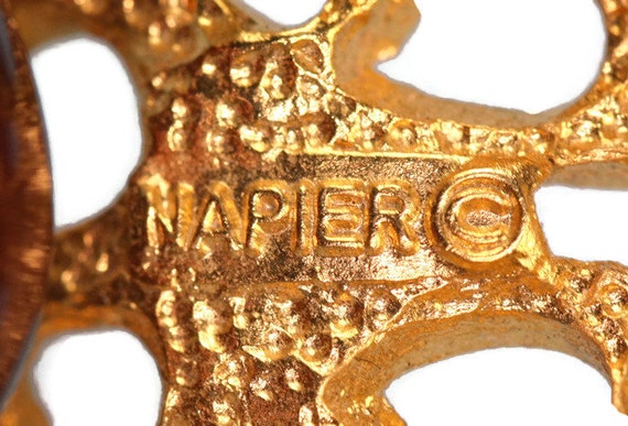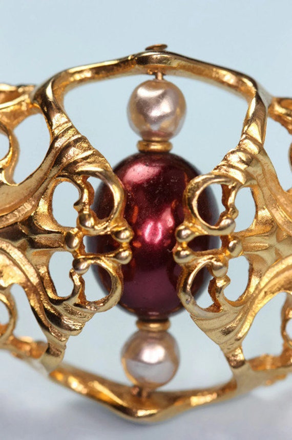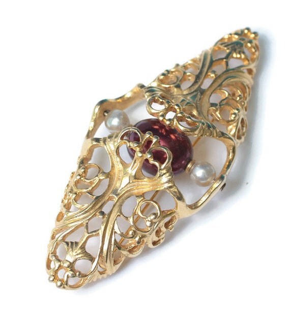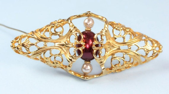 15% OFF coupon on Large Faux Pearl Filigree Brooch Napier Diamond Shaped Burgundy Pearl Book Piece 1985 Worldly Temptations by PastSplendors