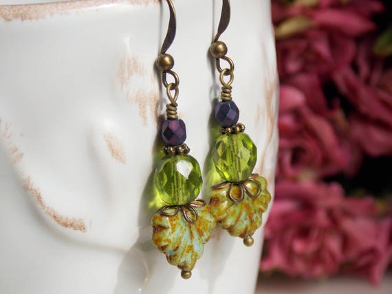 FREE SHIPPING coupon on Leaf Earrings Czech Glass Earrings Maple Leaf Earrings Picasso Green Purple Czech Glass Jewelry Earthy Woodland Autumn Gift Earrings by NickiLynnJewelry