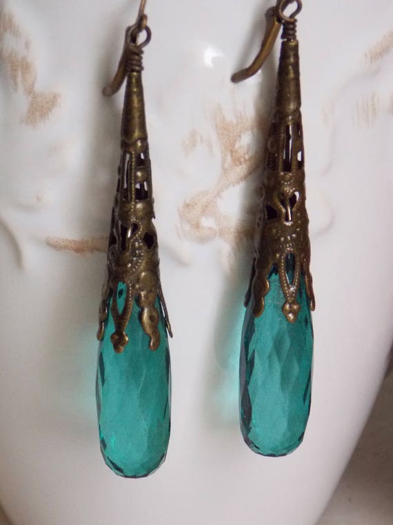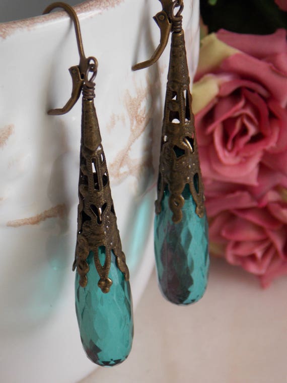 FREE SHIPPING coupon on Long Filigree Earrings Vintage Teal Lucite Crystals Wrapped Antiqued Brass Victorian Vintage Boho Blue Earrings by NickiLynnJewelry