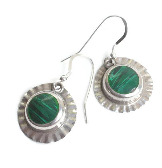 15% OFF coupon on Malachite and Sterling Dangle Earrings Mexico Circular Shape Ear Wires Vintage by PastSplendors