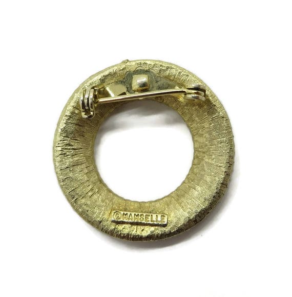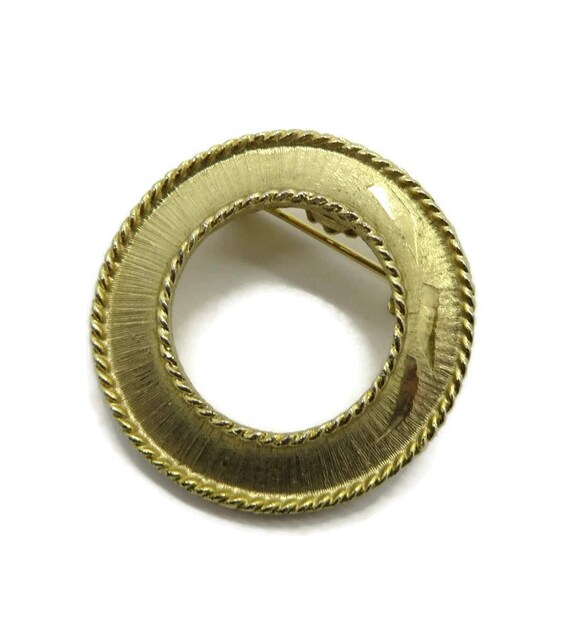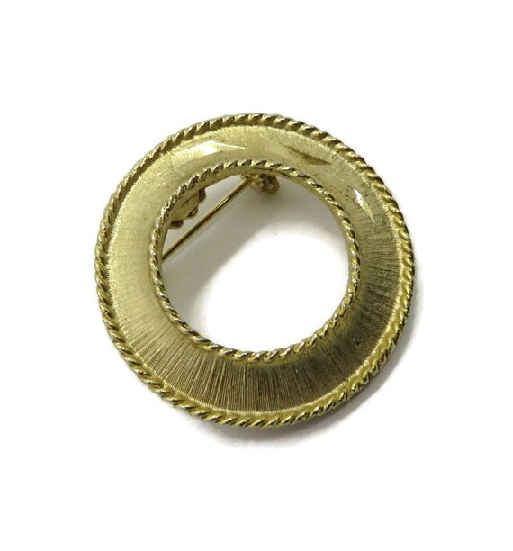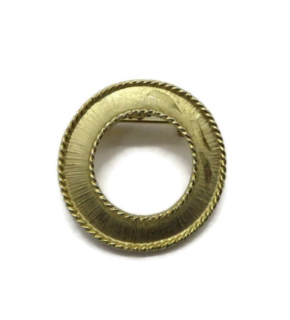 15% OFF coupon on Mamselle Circle Brooch Vintage Gold Tone Matte Etched Pin Signed Designer Costume Jewelry by LeesVintageJewels