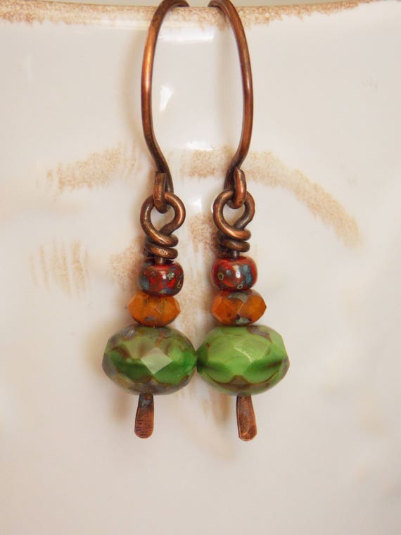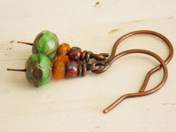 FREE SHIPPING coupon on Mixed Rustic Czech Beaded Earrings,Picasso, Stone, Red, Orange, Green Czech Earrings, Oxidized Copper Small Light Woodland Earrings by NickiLynnJewelry