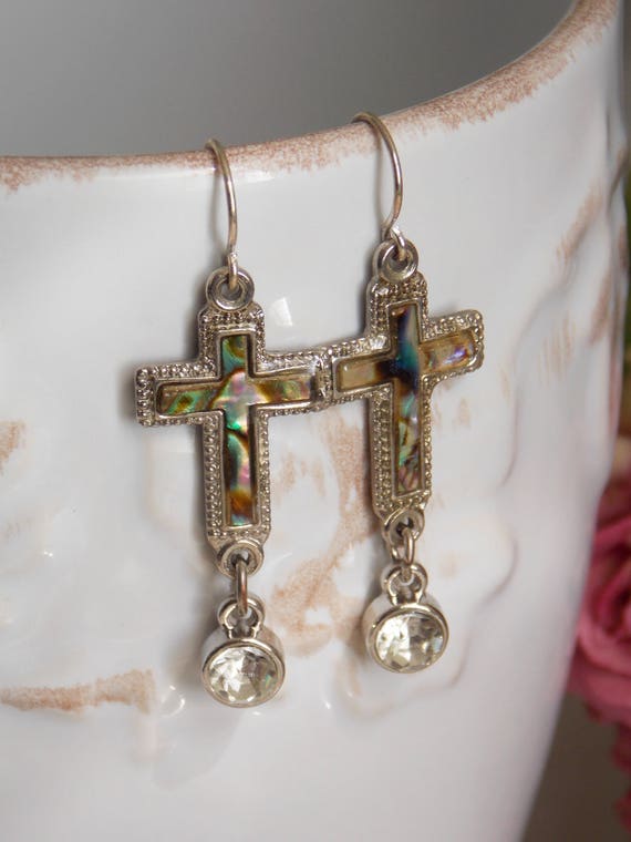 FREE SHIPPING coupon on Mother of Pearl Abalone Shell Cross Earrings Pierced Dangling Minimalist One of Kind 1970s Rhinestone Christian Boho Bohemian Chic by NickiLynnJewelry