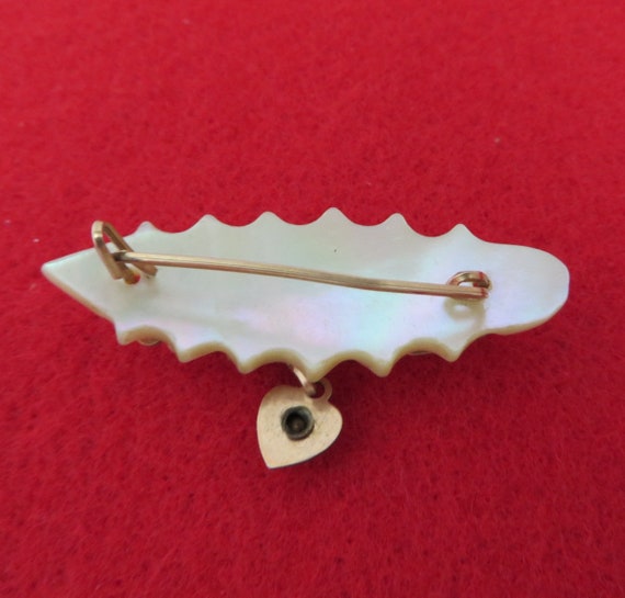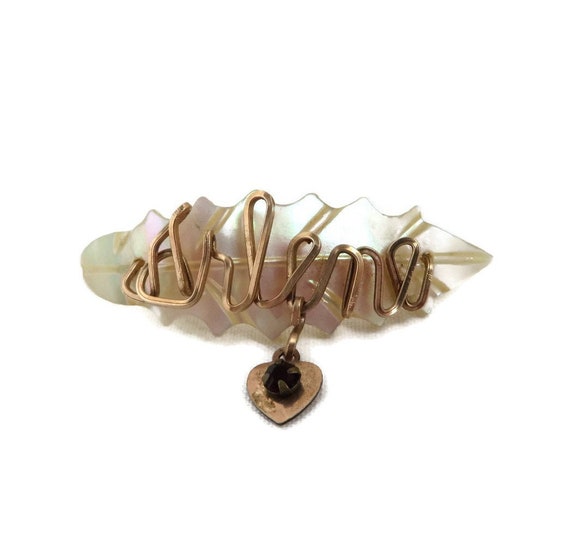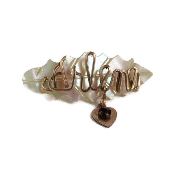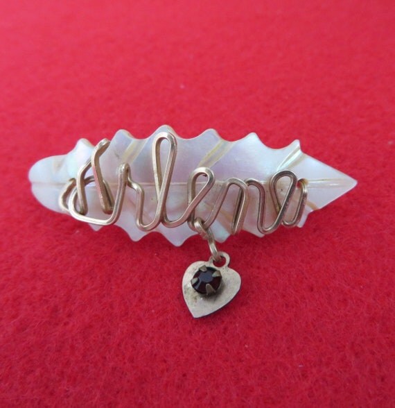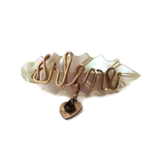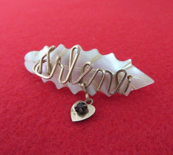 15% OFF coupon on Mother of Pearl Name Brooch, Vintage Carved Shell Brooch, Gold Wire Script "Arlene", Dangling Heart Red Bead Brooch by LeesVintageJewels
