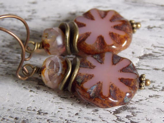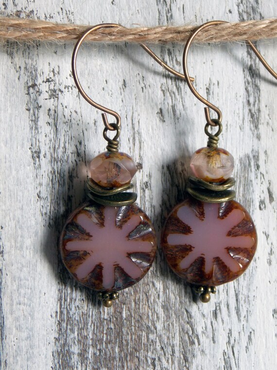 FREE SHIPPING coupon on Opal Mauve Starburst Earrings Czech Glass Beaded Earrings Rustic Woodland Earthy Bead Pink Boho Dangle Drop Earrings by NickiLynnJewelry